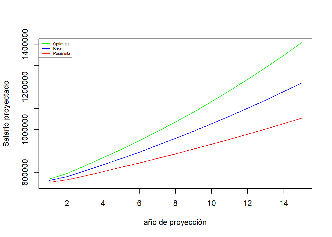 rate<-rep(0.035,15) # se crea las tasas de incremento salarialrate[1]<-0.015rate[2]<-0.025Acum<-1+rateAcum<-cumprod(Acum)Sal_ini=750000Sal_proy<-Sal_ini*Acum#Pesimista Se rebaja la inflación 1%ratep<-rep(0.025,15)ratep[1]<-0.005ratep[2]<-0.015Acump<-1+ratepAcump<-cumprod(Acump)Sal_proyp<-Sal_ini*Acump#Optimista Se sube la inflación 2%rateo<-rep(0.045,15)rateo[1]<-0.025rateo[2]<-0.035Acumo<-1+rateoAcumo<-cumprod(Acumo)#plot(Acumo)Sal_proyo<-Sal_ini*Acumoplot(Sal_proy, type="l", ylab="Salario proyectado",xlab="año de proyección",col="blue2",ylim=c(750000,1400000))lines(Sal_proyp, type="l", col="red2")lines(Sal_proyo, type="l", col="green2")legend(x="topleft",legend=c("Optimista","Base","Pesimista"),col=c("green2","blue2","red2"),lty=c(1,1,1),lwd=2,cex=0.5)