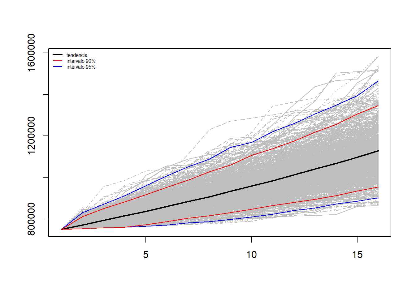 Por otro lado, otro actuario considera que considerar la inflación de los 2 últimos años, y se obtiene que el promedio la inflación ha estado entre 0,75% con una varianza del 13.95, considera que los incrementos se comportan log normalmente, y que el comportamiento de ascensos y promociones es de un 0,5%. Con el salario inicial, realiza 1000 escenarios