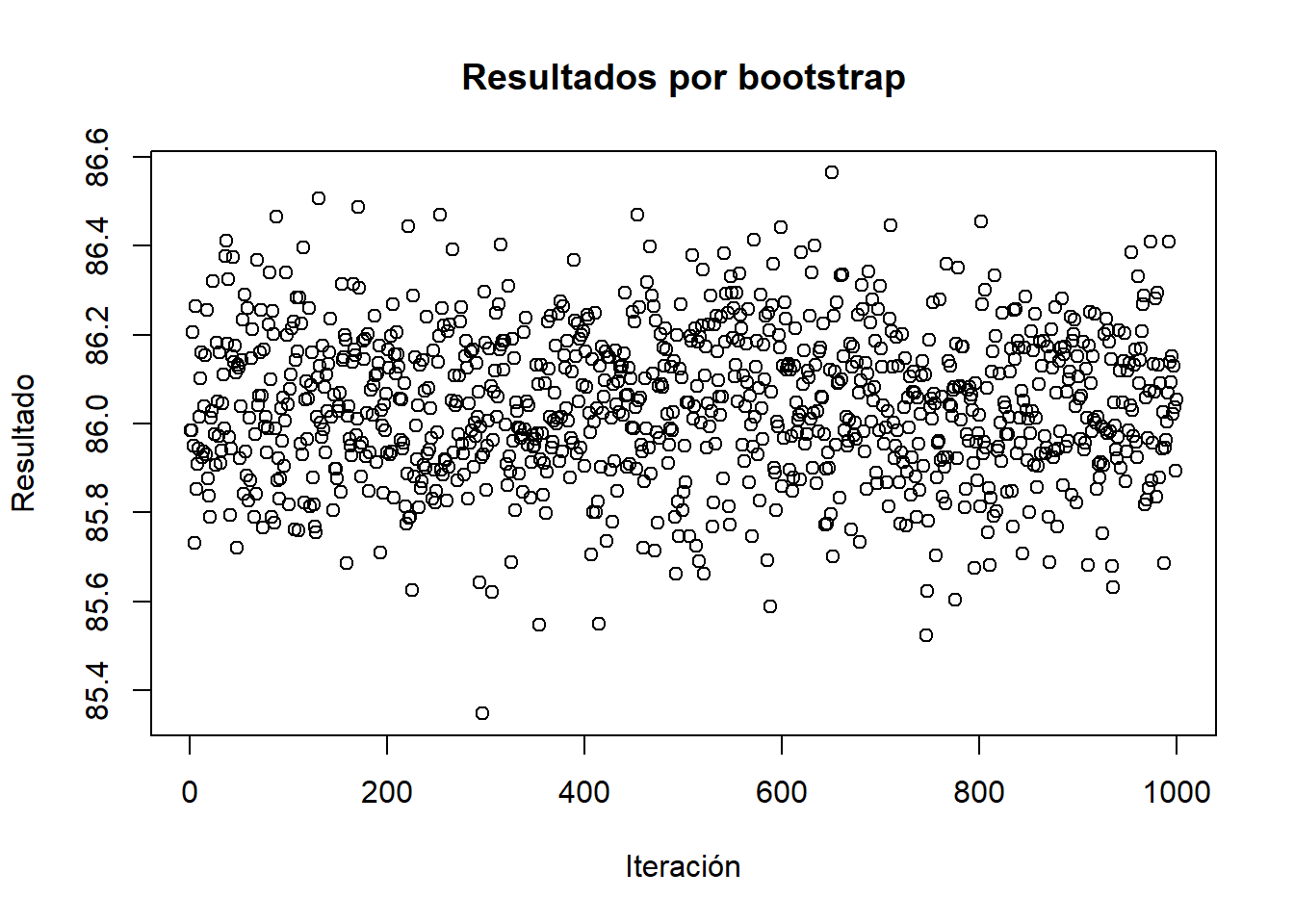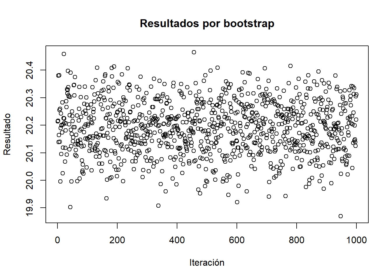 plot(results$t,main="Resultados por bootstrap",ylab="Resultado",xlab="Iteración")