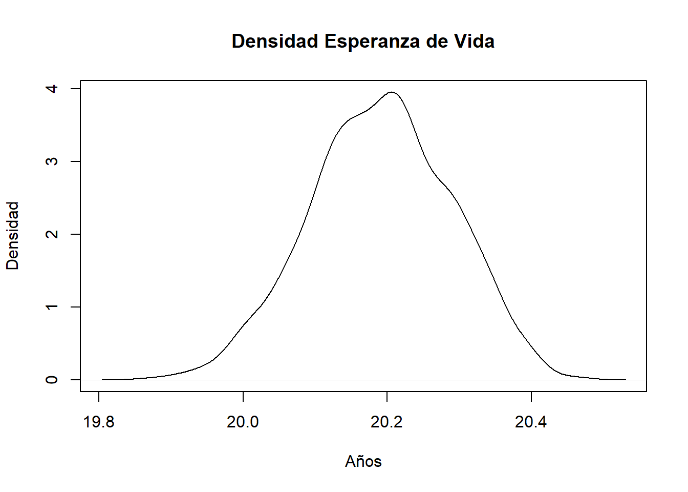 plot(density(results$t), main="Densidad Esperanza de Vida",xlab="Años",ylab="Densidad")
