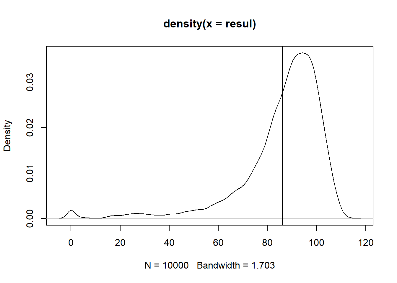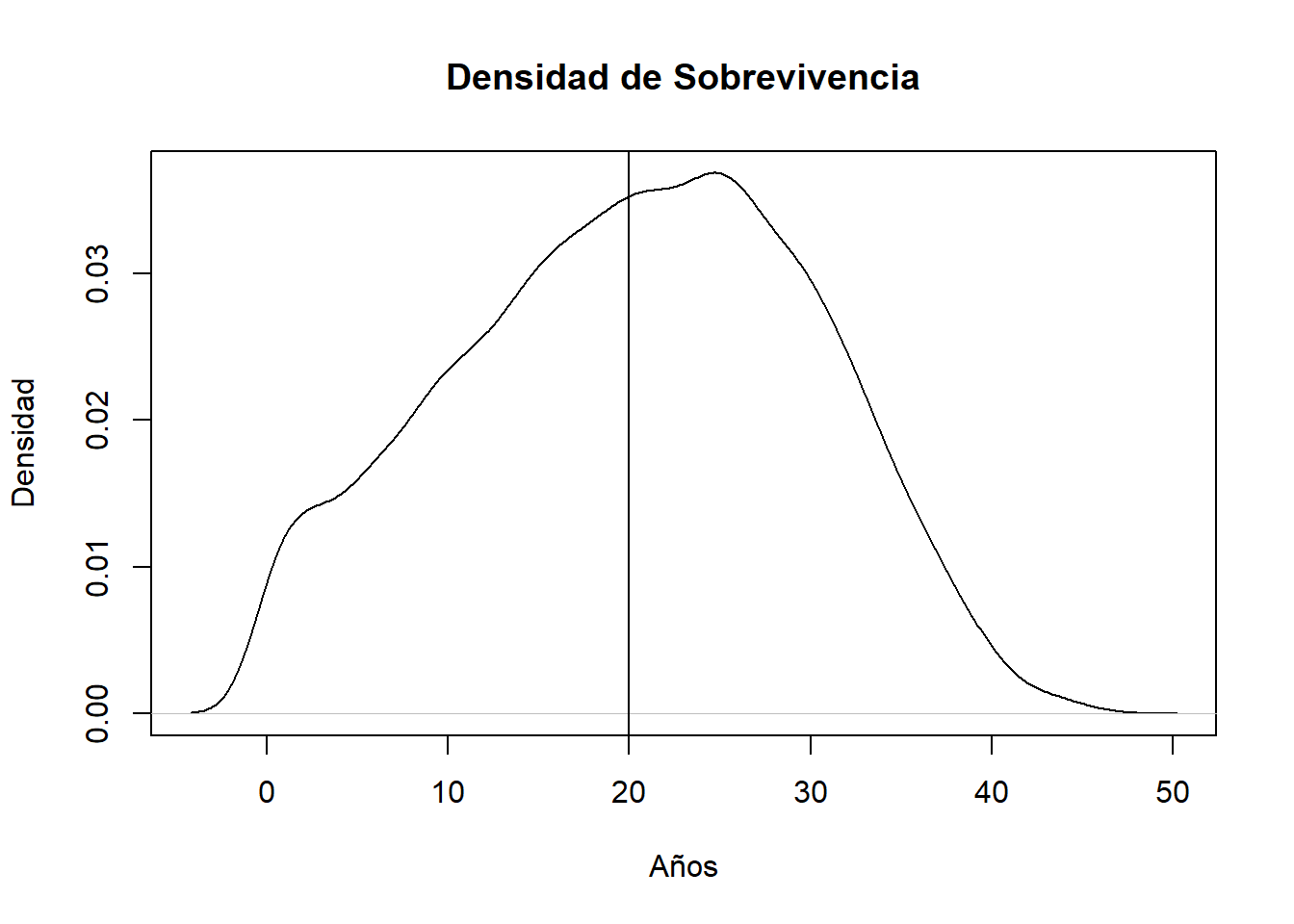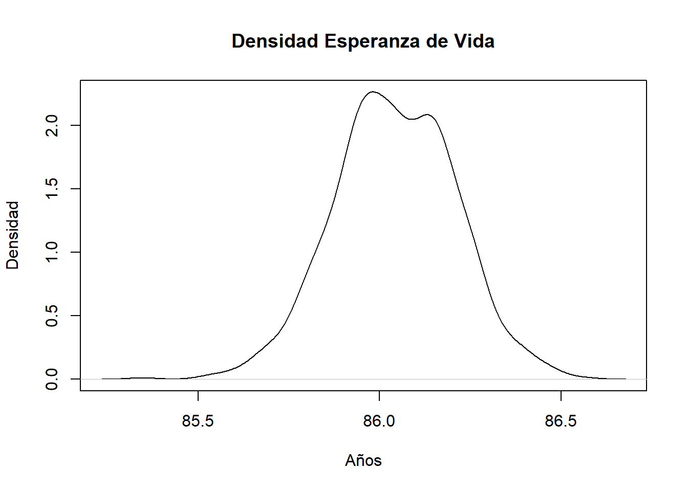 Este proceso como se observa, nos permite construir una curva de densidad y estimando la esperanza muestral nos da como resultado 86.4769 años de esperanza de vida, como observamos existe un diferencia con la estimación tradicional, esto producto del error de estimación, que podemos calcular de la siguiente manera: