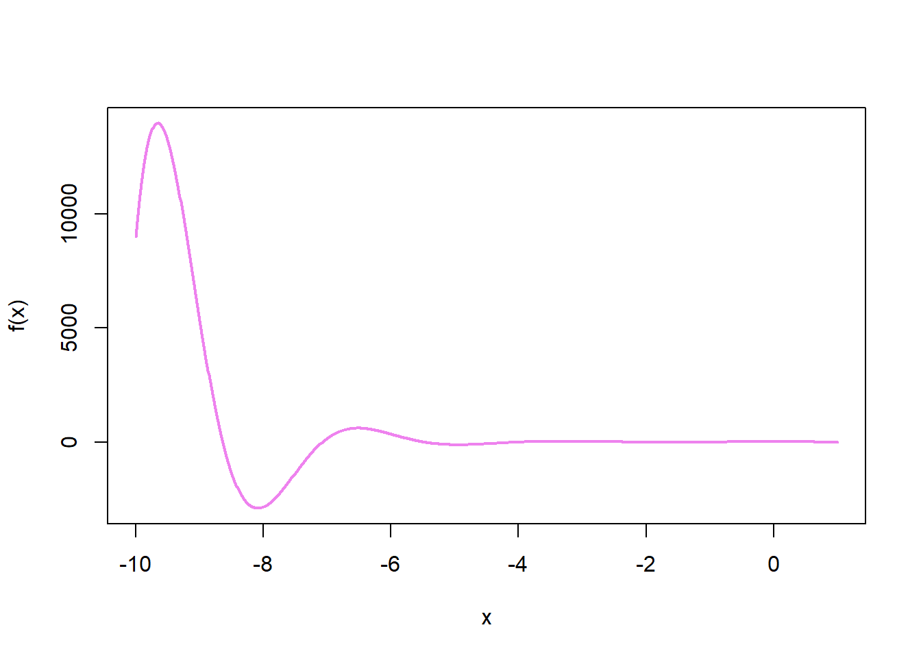 Si delimitamos a \(f(x)\) en el intervalo \([-10,10]\) podemos observar que posee varios mínimos y máximos locales.