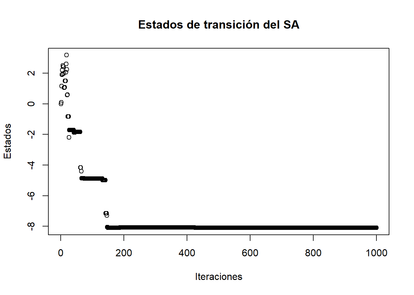 resim <-function(f, alpha=0.5, s0=0, niter,mini=-Inf,maxi=Inf) {s_n <- s0estados<-rep(0,niter)iter_count <-0for (k in1:niter) { estados[k]<-s_n T <- (1- alpha)^k #Se reduce el T según el número de iteraciones s_new <-rnorm(1, s_n, 1) #Distribución del SAif(s_new<mini){s_new=mini}if(s_new>maxi){s_new=maxi} dif <-f(s_new) -f(s_n)if (dif <0) { s_n = s_new } else { random <-runif(1,0,1)if (random <exp(-dif/T)) { s_n <- s_new } } iter_count <- iter_count +1}return(list(r=s_n,e=estados))}Resultado <-resim(f,0.1,0,1000,-10,10)cat("Punto donde se alcanza el mínimo global \n")