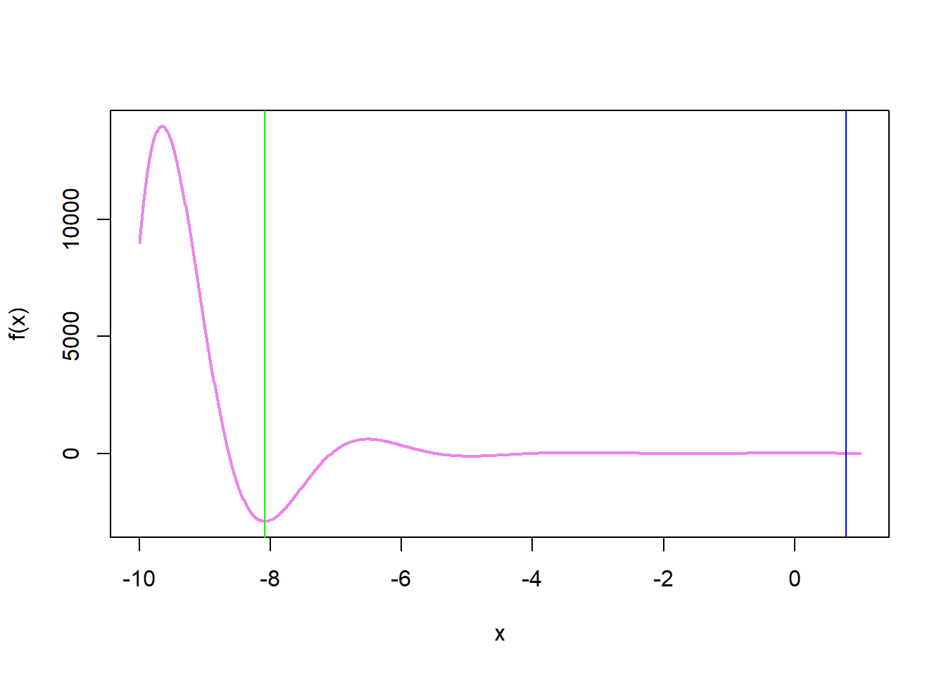 Si ejecutamos el algoritmo de Newton-Raphson para llamar el mínimo en el intervalo \([-10,10]\) obtenemos un mínimo local en \(x\approx 0.7854\)