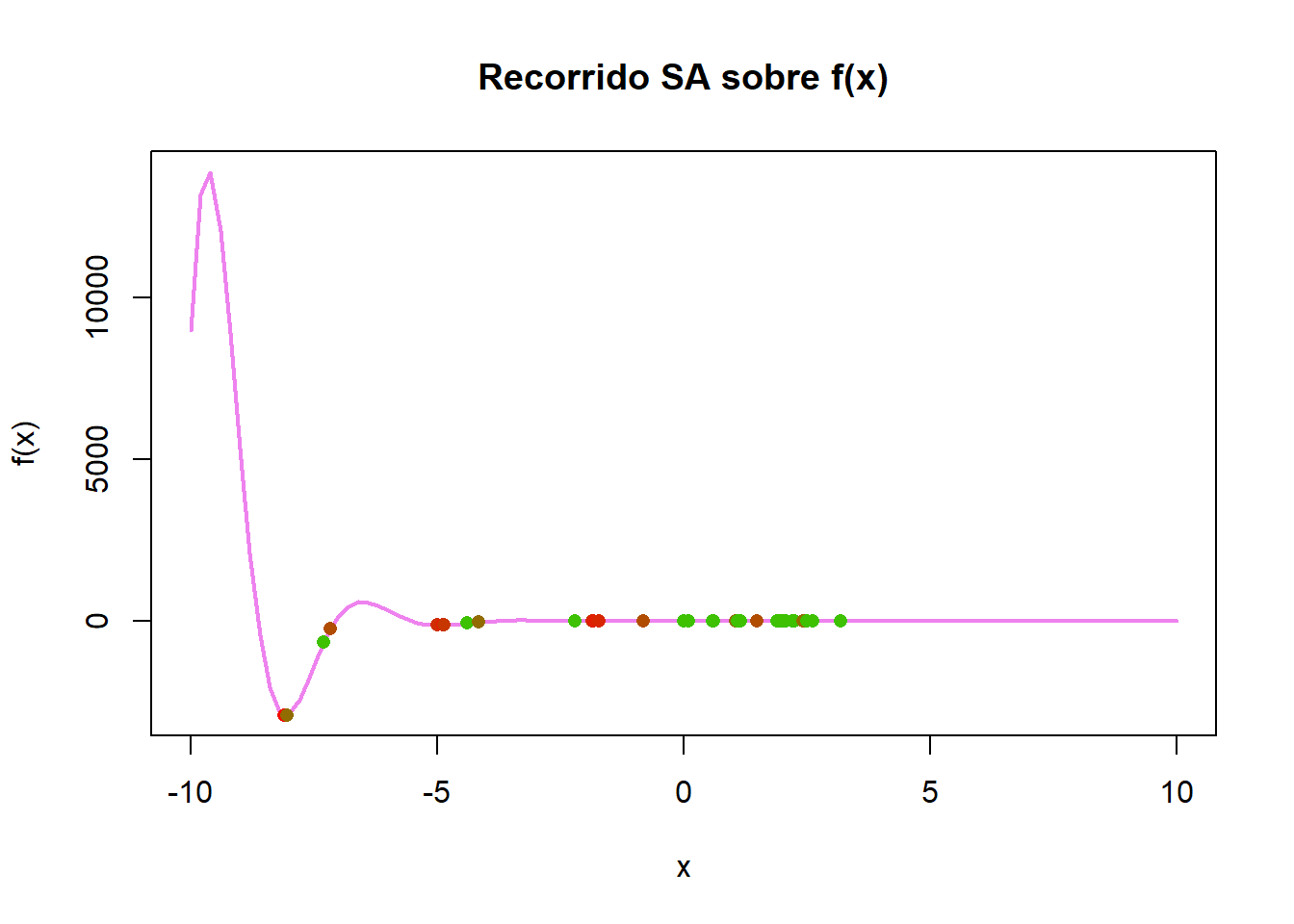 #Estimar la veces que esta en un estadoestado_tab <-table(round(Resultado$e, 2)) estados <-as.numeric(names(estado_tab))frec <-as.numeric(estado_tab)col_pal <-colorRampPalette(c("green", "red"))(length(frec))colores <- col_pal[rank(frec)]curve(f, from=-10, to=10, col="violet", lwd=2,xlab="x", ylab="f(x)", main="Recorrido SA sobre f(x)")points(estados, f(estados), col=colores, pch=16)