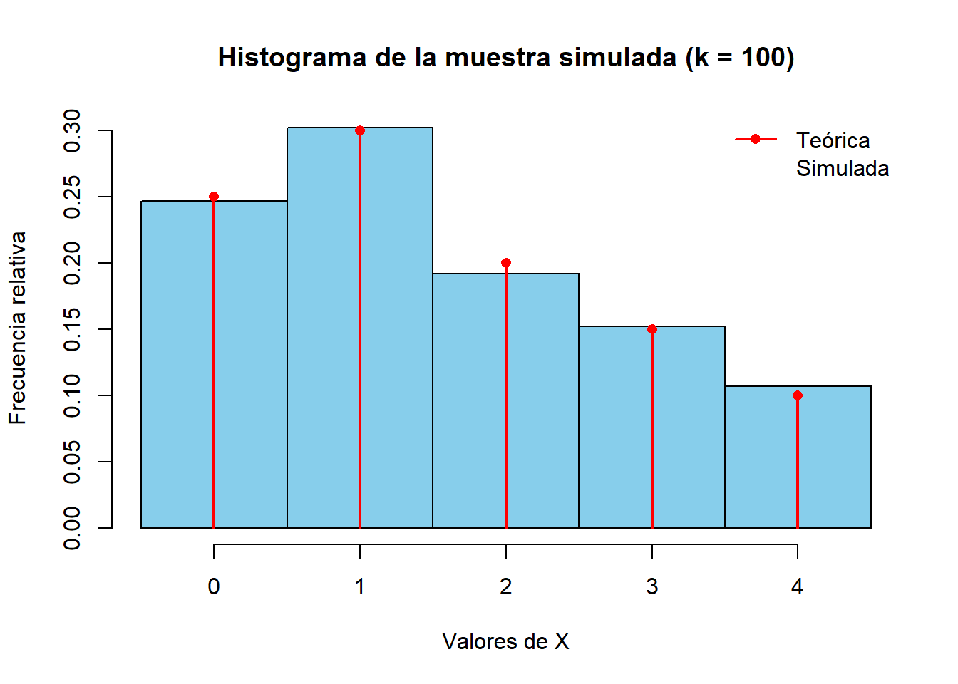 # Definición de la distribución discretax <-0:4p <-c(0.25, 0.30, 0.20, 0.15, 0.10)Fx <-cumsum(p) # Función de distribución acumulada# Tamaño de la muestrak <-1000# Generación de la muestra por el método de la inversaset.seed(2025) #Semilla para simulacionesu <-runif(k)y <-sapply(u, function(ui) { x[ which(ui <= Fx)[1] ]})# Histograma de la muestra simuladahist(y,breaks =seq(min(x) -0.5, max(x) +0.5, by =1),freq =FALSE,col ="skyblue",main ="Histograma de la muestra simulada (k = 100)",xlab ="Valores de X",ylab ="Frecuencia relativa")# La distribución teórica para compararpoints(x, p, col ="red", pch =16)lines(x, p, type ="h", col ="red", lwd =2)legend("topright",legend =c("Teórica", "Simulada"),col =c("red", "skyblue"),pch =c(16, NA),lty =c(1, NA),pt.cex =c(1, NA),bty ="n")