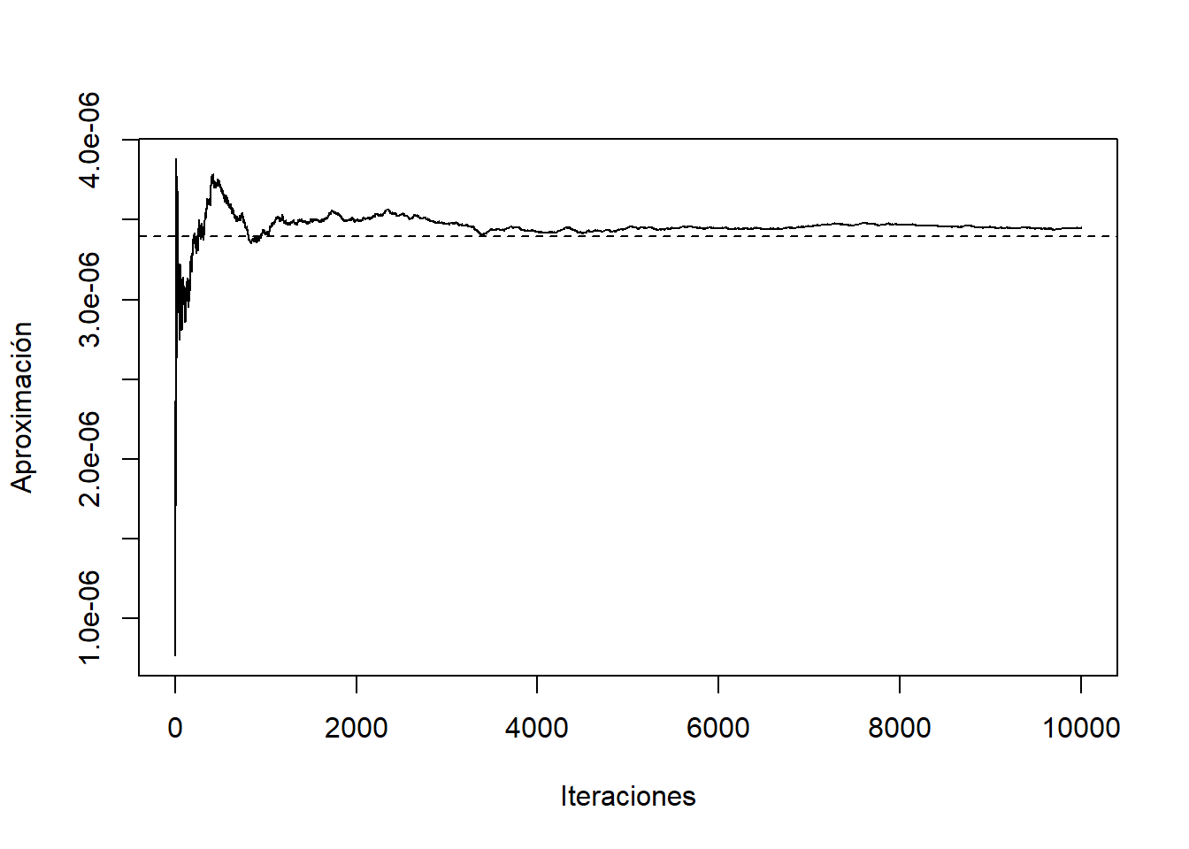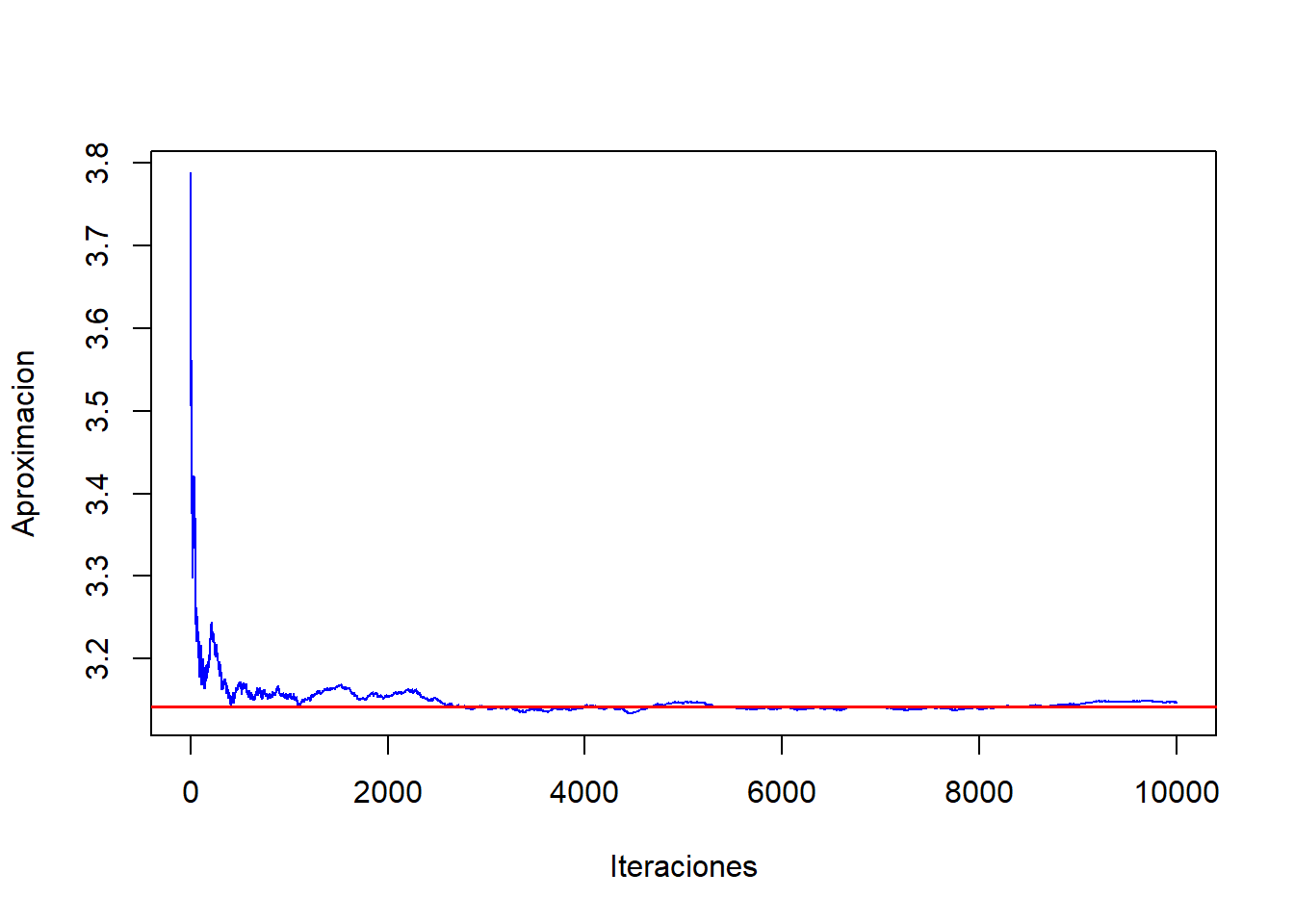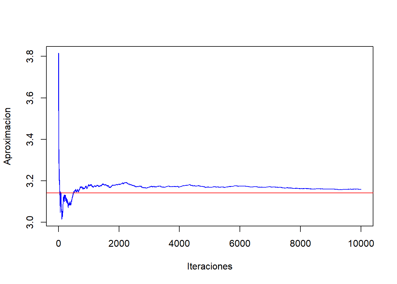 plot(1:n,acumulado,col="blue",type="l",ylab="Aproximacion",xlab="Iteraciones")