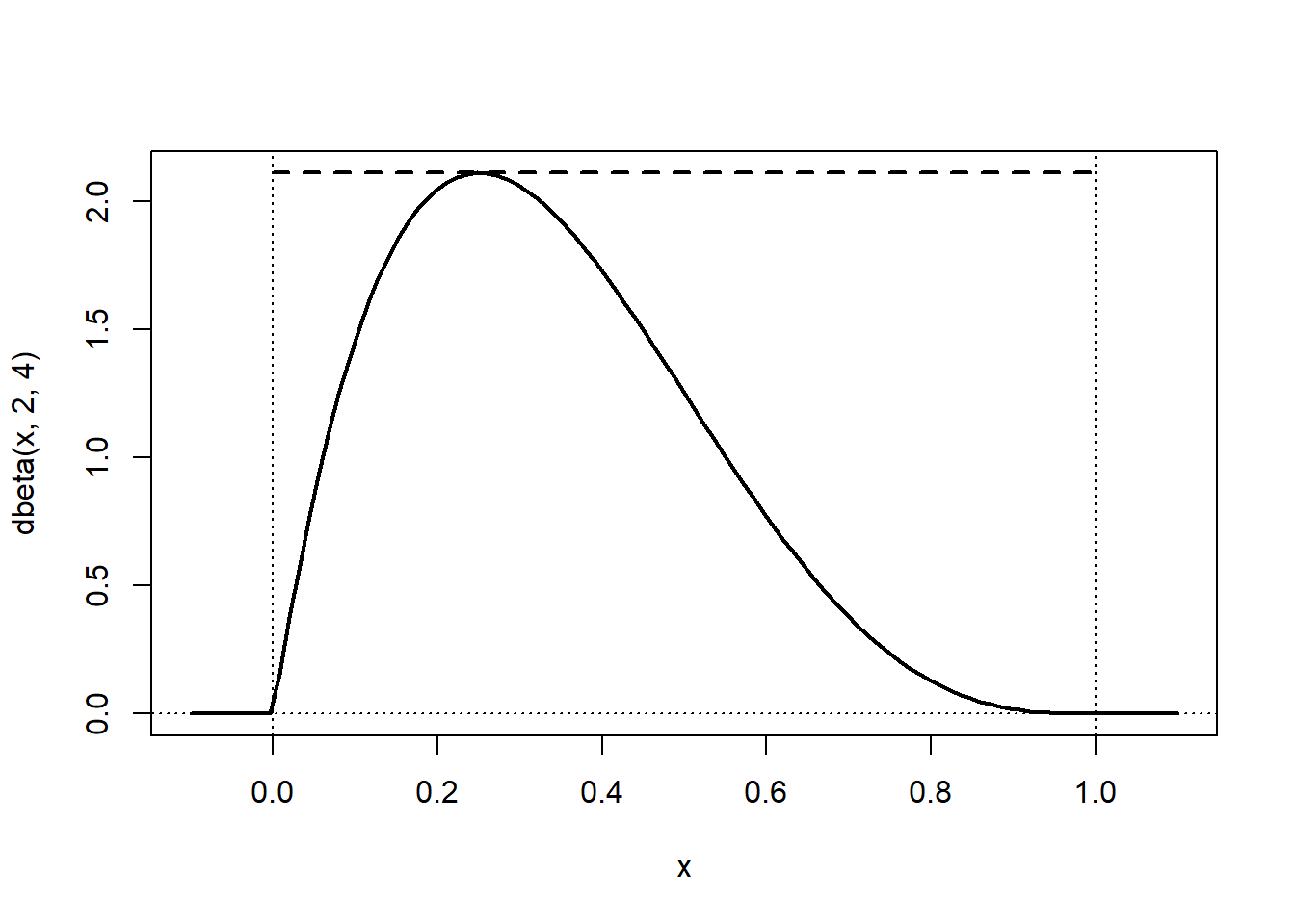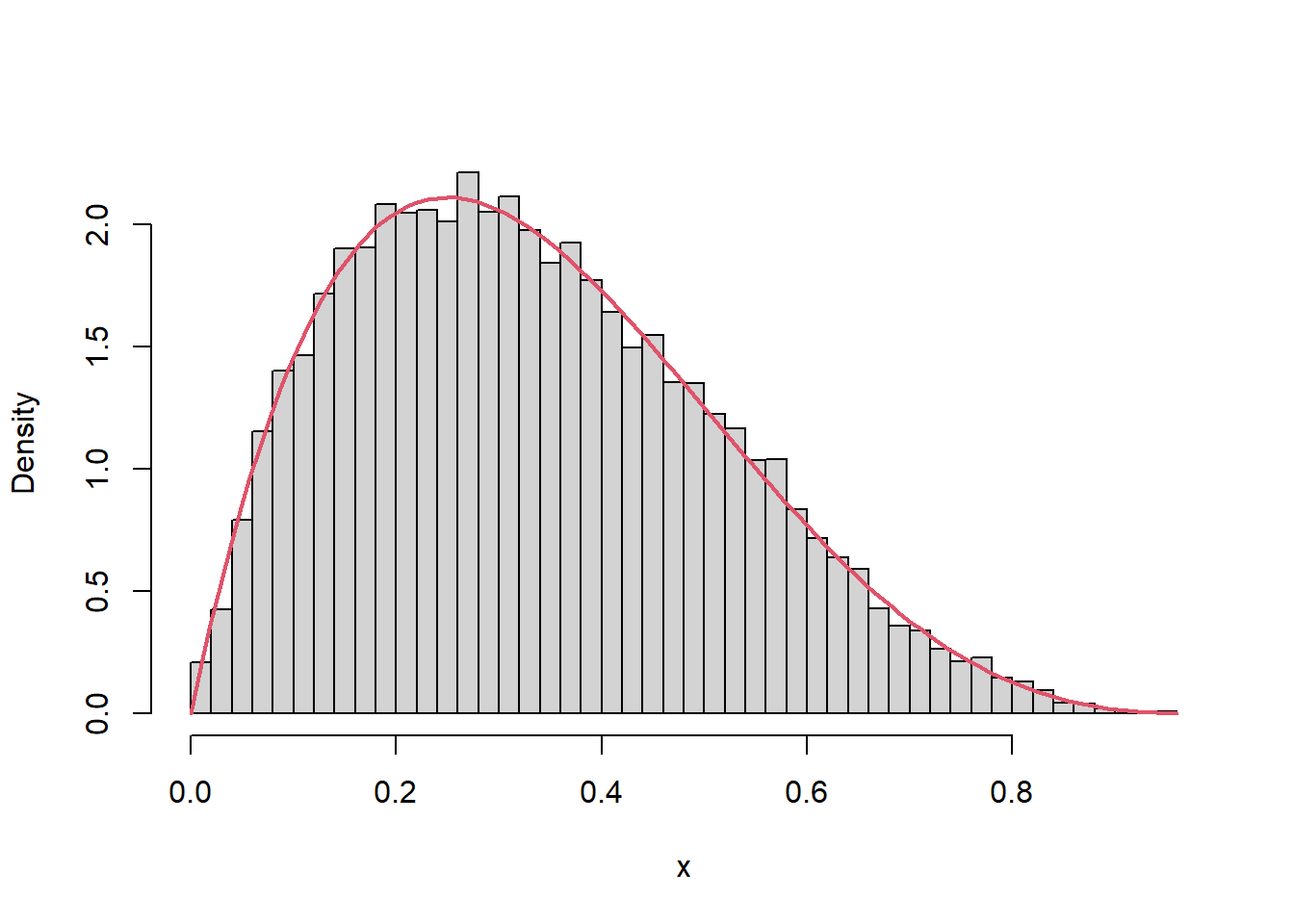 curve(dbeta(x, 2, 4), col = 2, lwd = 2, add = TRUE)