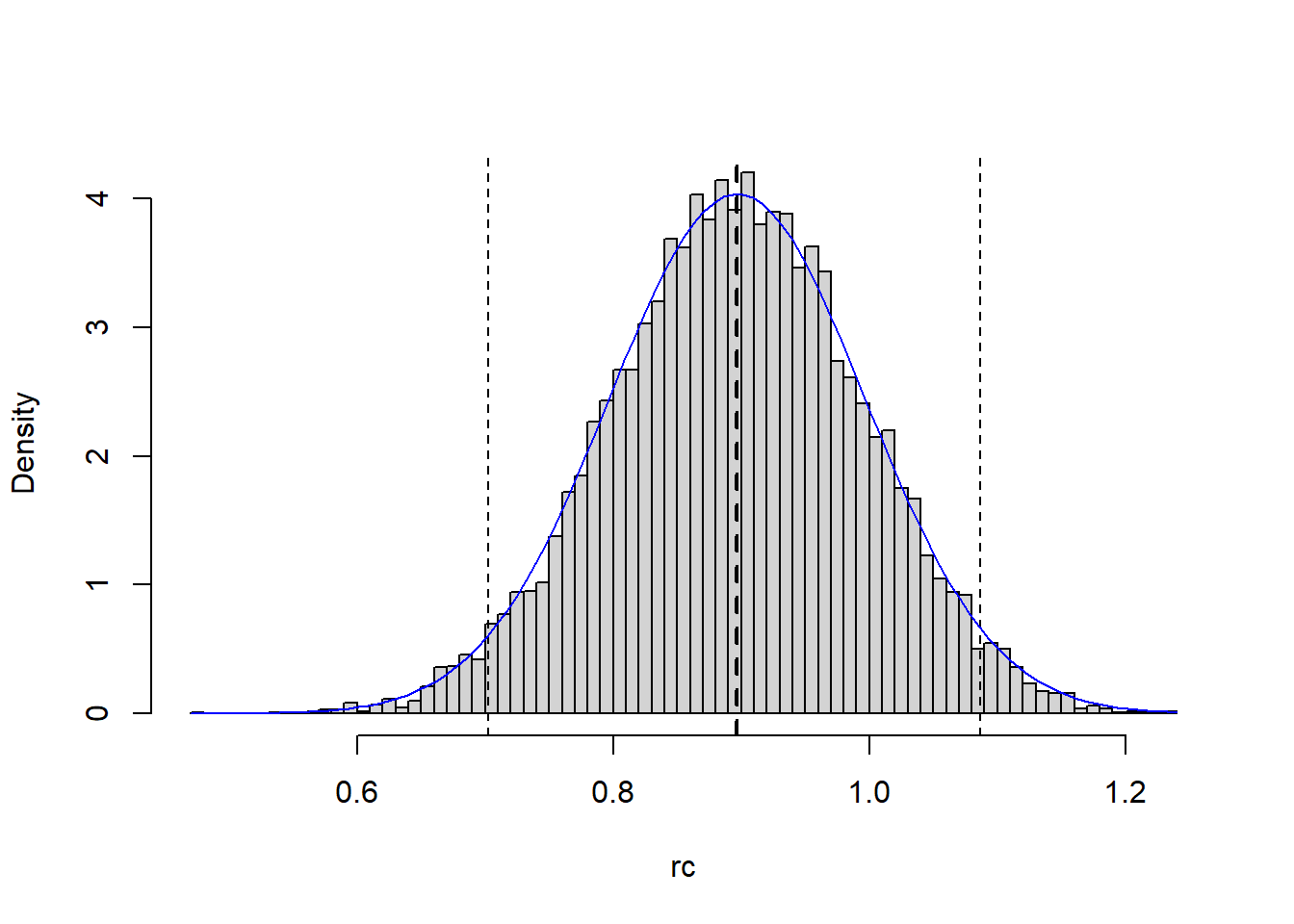 abline(v = mean(rc), lty = 2, lwd = 2) # Estimación Bayesiana