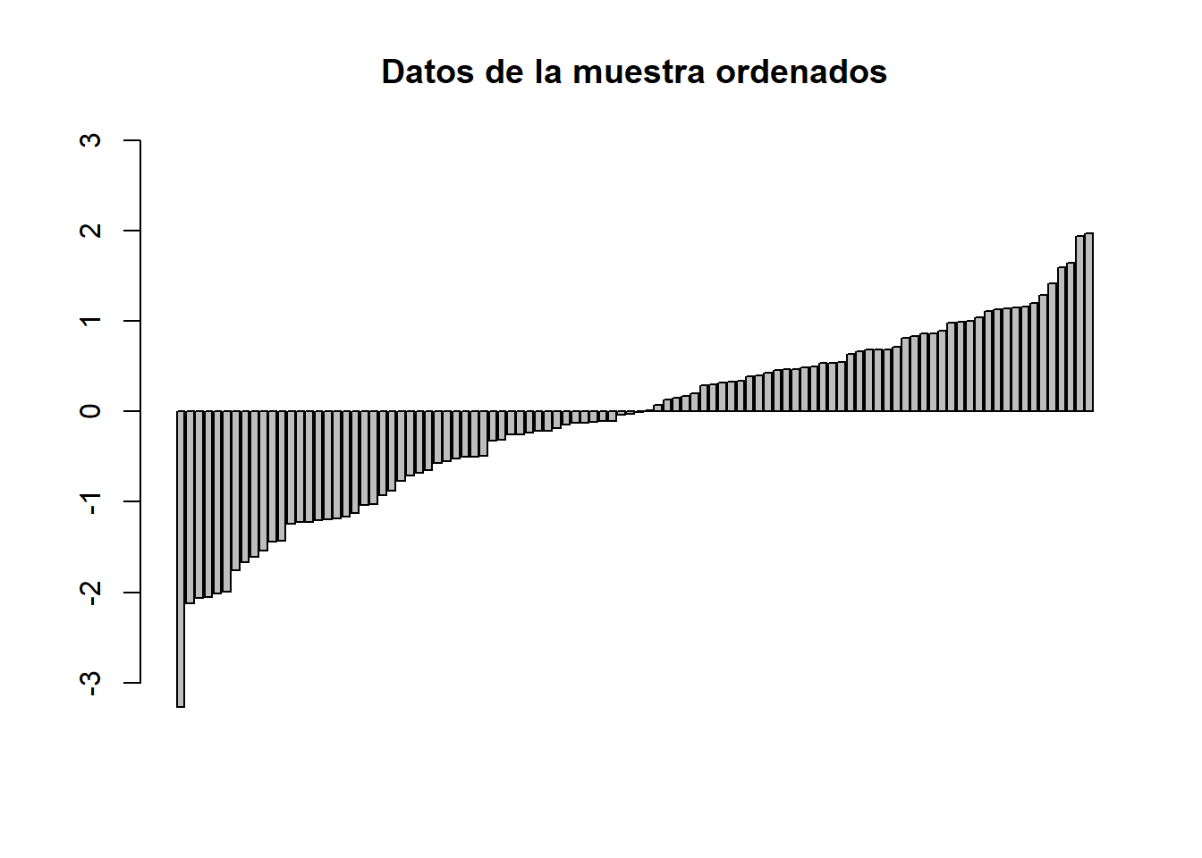 barplot(sort(x), ylim=c(-3,3), main="Datos de la muestra ordenados")