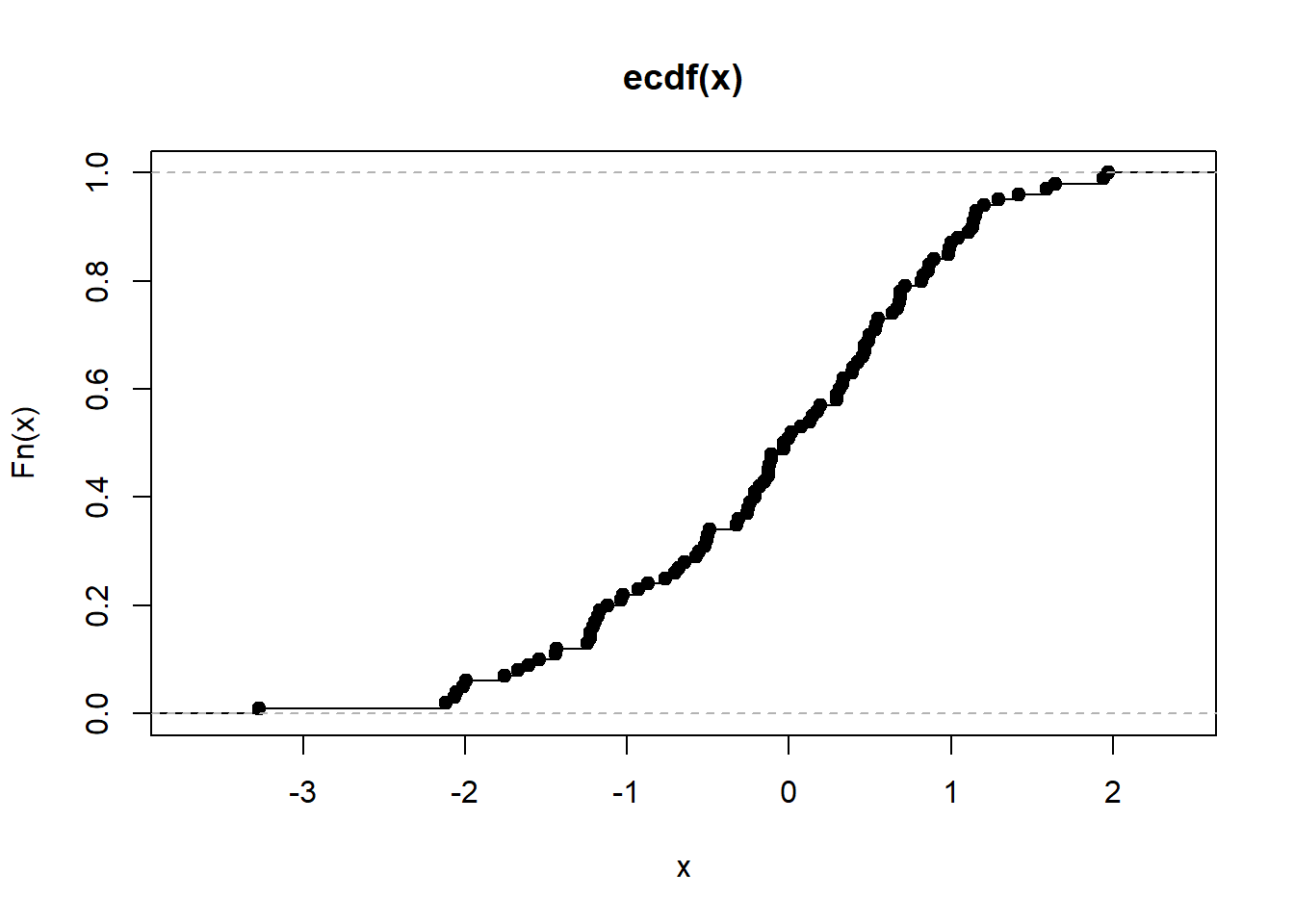 Si realizamos 100 muestras de una normal de media 0 y varianza 1, y gráficamos sus máximos y su probabilidad acumulada obtenemos los siguientes resultados: