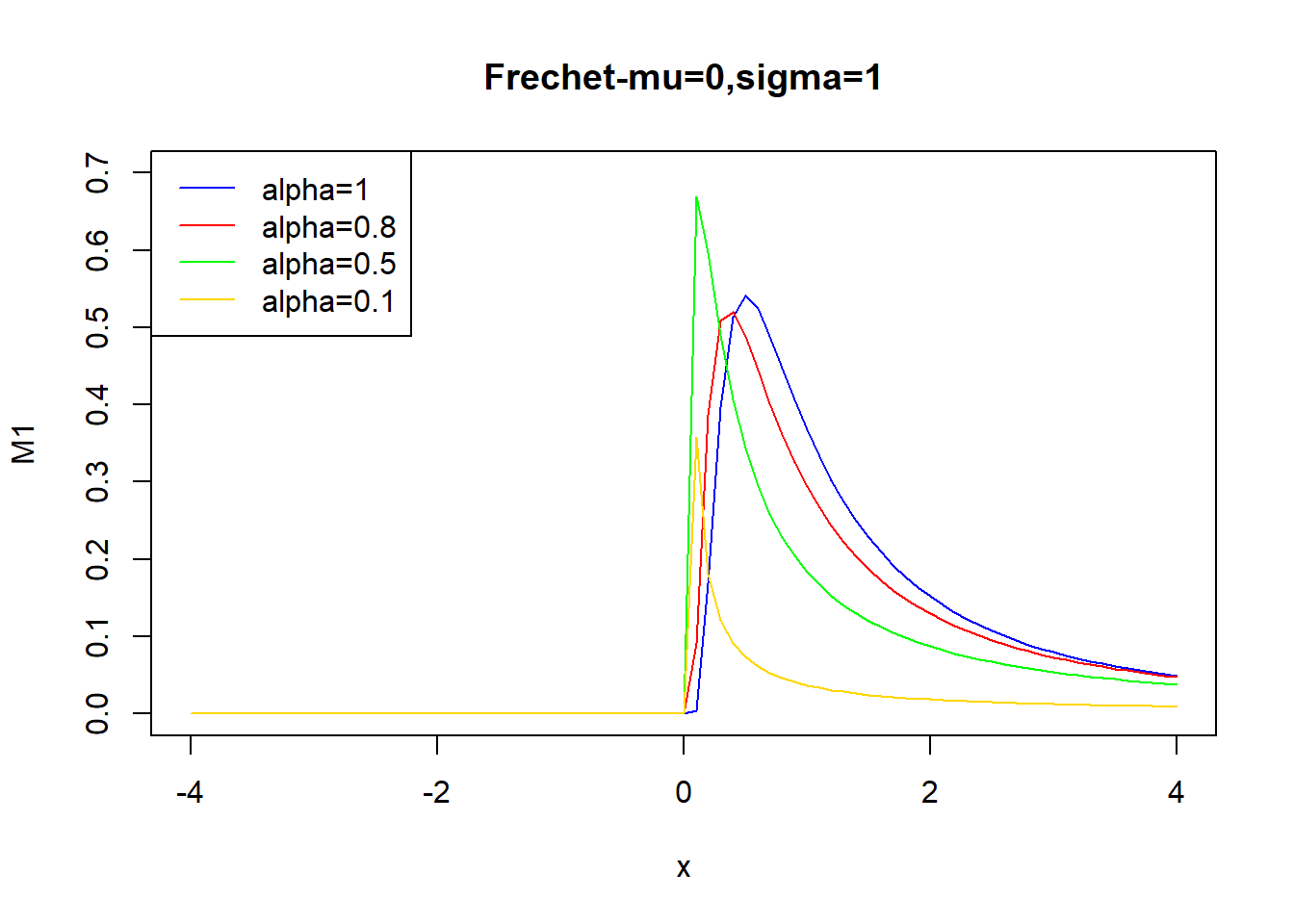 \[ H(x,\mu,\sigma, \alpha)=\begin{cases} e^{-((x-\mu)/\sigma)^{-\alpha}} & x >\mu \\ 0 & x \leq \mu \end{cases} \] con \(\alpha >0\)